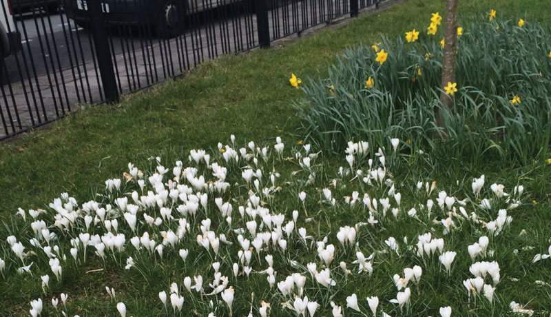Friends of Pentre Gardens are working in conjuction with Renata Harmsworth from St Patrick's School, one of Grangetown's 4 primary schools. Year 2 children (6 and 7 year olds) from St Patricks's school planted the yellow crocuses two years ago as part of the school's lunch hour gardening club, and since then they have gone on to plant the white and purple crocuses, three new trees and the daffodils that can be seen today in the park.